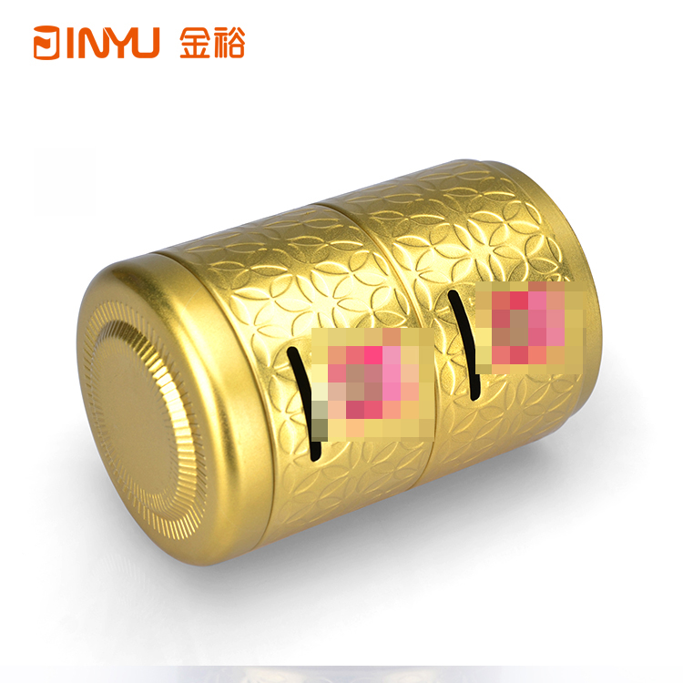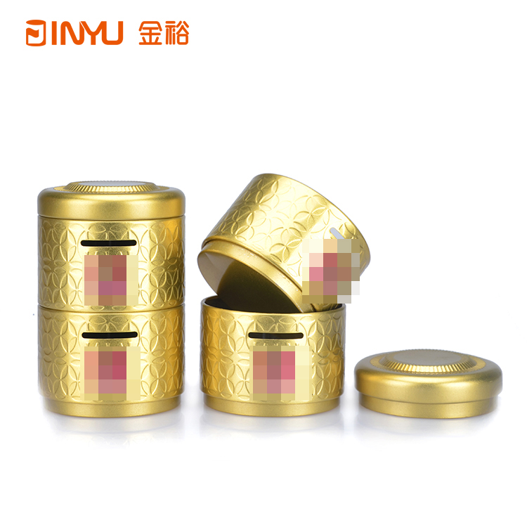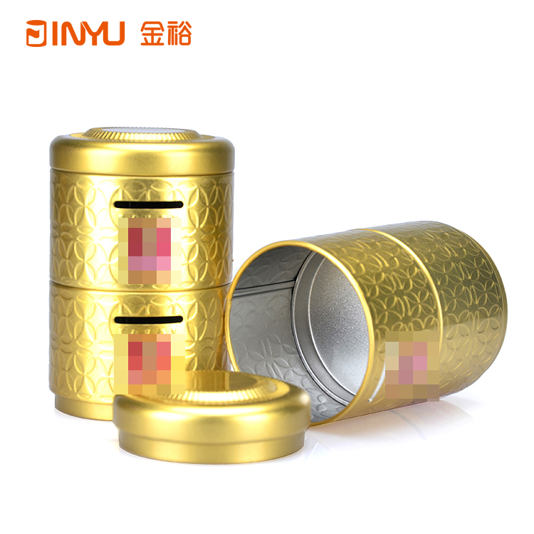 鐵罐表面做激凸花紋雕刻處理,鐵罐身體部位做開(kāi)口處理,用于硬幣等紀(jì)念品的投入。