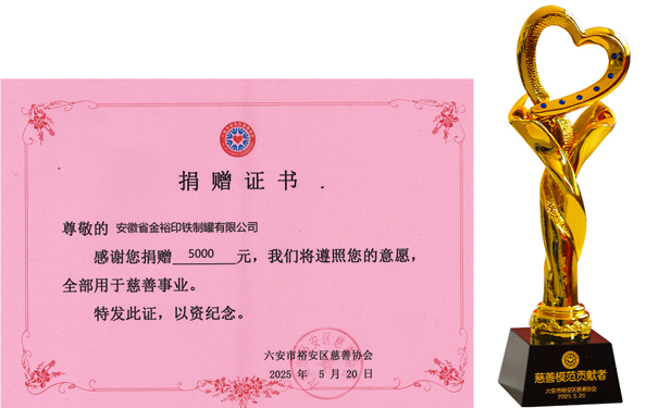 作為從裕安這片熱土上成長起來的本土企業(yè),金裕制罐深知企業(yè)的發(fā)展離不開家鄉(xiāng)人民的支持與社會(huì)各界的關(guān)愛?!案卸魃鐣?huì),回饋桑梓”早已融入我們的血脈,成為企業(yè)堅(jiān)定不移的核心價(jià)值理念。多年來,我們始終將慈善公益視為己任,用點(diǎn)滴行動(dòng)傳遞溫暖: