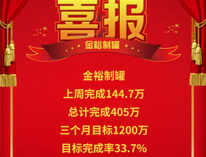 今天是2018年7月31日,牛商爭(zhēng)霸賽的第一階段即將結(jié)束,6月25日的啟動(dòng)大會(huì)還歷歷在目,時(shí)間卻已悄然掠過(guò)。這一個(gè)月,金裕制罐總計(jì)完成了405萬(wàn)銷售額,而三個(gè)月的總目標(biāo)是1200萬(wàn),目標(biāo)完成率33.7%,金裕制罐超額完成了第一階段的計(jì)劃。按照目前發(fā)展勢(shì)頭,拿下1200萬(wàn)...